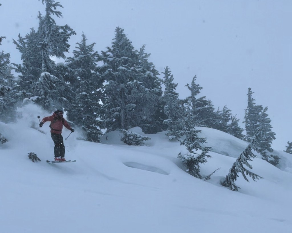 As we made our way to the saddle we were aiming for, we found a deepening snowpack. Has the snow been moving the snow off of the south face? We transitioned and waited for a tiny bit of better lighting to make our way to the trees. Nothing quite has defined this winter like poor visibility within a white alpine environment. After a few hundred feet of skiing braille, we found ourselves in the trees. The snow up to this point was stellar, but as we entered the trees, we found ourselves in shocking deep powder. Turns were easily providing face shots when slashed, and plenty of lift was provided to my floaty skis.