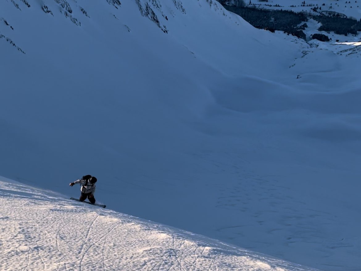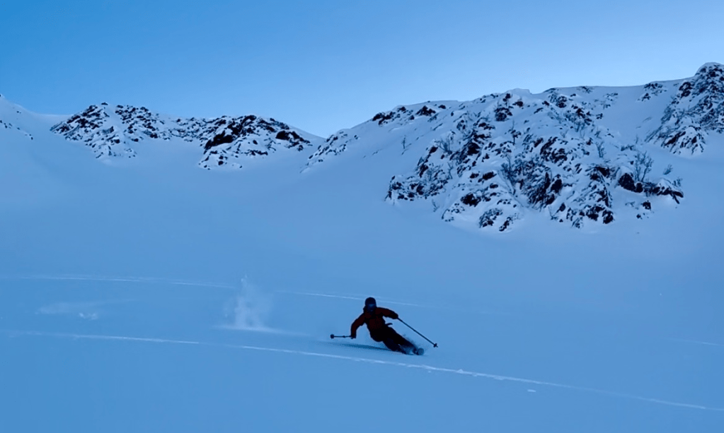 After wrapping up his line, I followed. I had scouted a line that held at a steeper angle than the rest of the bowl for the first quarter of the line or so, and I got the privilege of finding fully untracked snow from top to bottom because of my choice of entry. I held a consistent pace, and enjoyed every turn I made even though the snow was rather variable. Punchy in places while being settled powder in others. I couldn’t help but let out a yell of joy at the bottom; you won’t find me much happier than after a long consistent ski line.