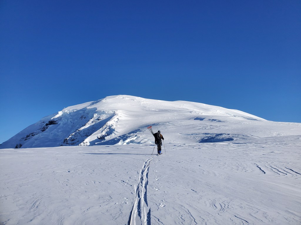We swapped between skis and crampons a few times throughout the rest of the climb, with a good section even sidestepped with skis on (not recommended). Upon reaching the plateau before the low angle summit push, we donned our heaviest puffies and Alti Mitts. After a full day on a mountain that never seemed to change in uphill views, we could finally see a defined peak. I was surprised with how short the tour to the peak ended up being. Upon reaching the domed summit, we took a few pictures, but elected to ski back to warmth quickly.