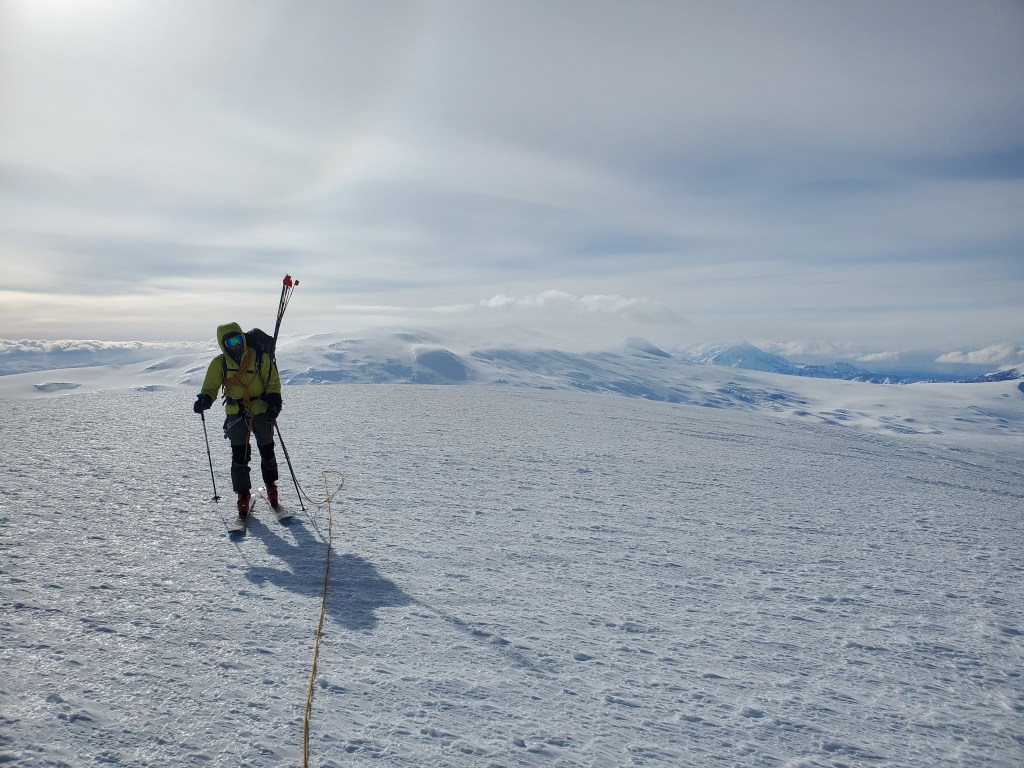 Crevasses were beginning to show their faces through thin snow bridges, but nothing too large had appeared. It was on a complexly shaped convexity in the snow that I found myself keeping my skis perpendicular to the direction of the last crevasse I saw when I suddenly felt the snow underneath my skis collapse. I only have a moment to realize what I’ve done before I’m tumbling down the crevasse. Oddly enough, you’d imagine falling in a crevasse to be one of those slow motion moments, but I only remember the snow collapsing under my feet and then looking at my legs to make sure nothing was broken after I landed on them on a snow bridge around 20 feet into the crevasse. Miraculously everything seemed mostly okay other than a pretty painful nose, but I will take that over any lower body injuries when you are 60 miles from a road and on a glacier.