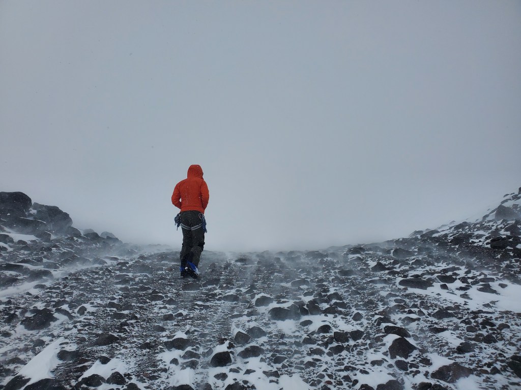 We woke the next morning to partially clear skies with similar winds that rolled in the evening before. We had a bit more than a mile before we approached a rocky outcropping that we could use as a handrail if the weather rolled in. Approximately halfway to the rocks, the weather rolled in with a heavy energy. Not only did winds pick up, but it began snowing as well. We quickly decided we needed to prioritize a good shelter over movement, so when we passed a deep moat next to the rocks, we made the call to stop the day there. Moving any further would have only invited uncertainty into the day, and I was happy to take the time of a half day to acclimate to elevation.