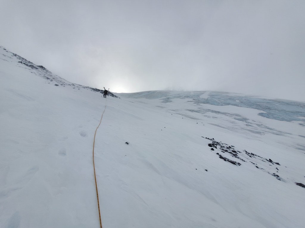 Our camp withstood the now expected increased winds of the evenings, but we were fully consumed by the clouds and had no visibility to make movement possible. With the alarm clocks set early, we went to bed hoping skies would clear the next day. Unfortunately, this was not the case, and we were forced to take a camp day if we wanted to climb Jarvis. We set our alarms early the next morning, and were pleased to find fully bluebird conditions to start the morning. We made food, packed out day packs, and headed out knowing these were the best conditions we had seen all trip. Things were going very smoothly for the first bit, but once we reached around 10,250 things began to get more complex.