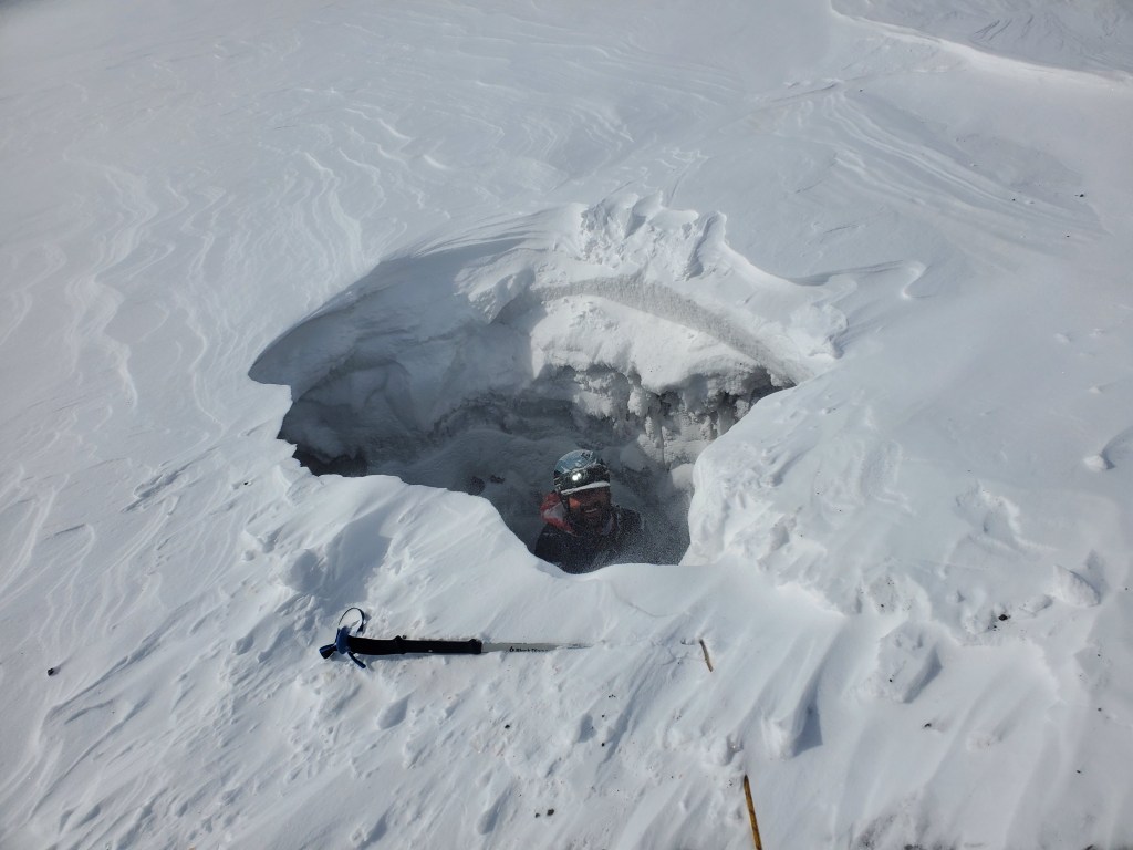 I gave him my warm layers, and quickly descended into the hole. First mission was to get his skis, one of which had fallen to the bottom. With just enough rope to reach the fallen ski, I forced myself deep into the constriction at the bottom of the 60 foot deep crevasse. I came out with the skis, and headed back in with a drop loop to haul the pack out. It was on the hauling that we managed to break the top strap of the bag. At this time I began to feel very sapped of energy, almost to the point of being sick. Cody offered to go back in and ascend with the bag out, and by the time he was back out I had realized the mistake I had made in giving him all my warm layers.