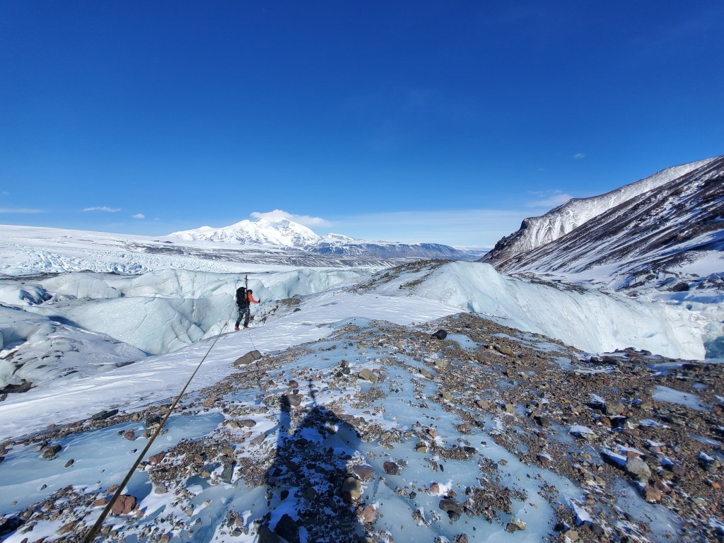 From here, we made quicker progress, but the constant transition between skis and boots kept us humble. Rock fall rained from above, and we knew we couldn’t rely on the moraine forever, but as we made our way down glacier we started to see an obvious weakness in the ice. After spending a good portion of the day on moraine, we found ourselves back on ice. There were pockets of snow that had held on through the relentless winds, but we ended up walking with our skis on blue ice for longer than anticipated. Eventually we found a camp that had just enough snow to pitch a tent in.