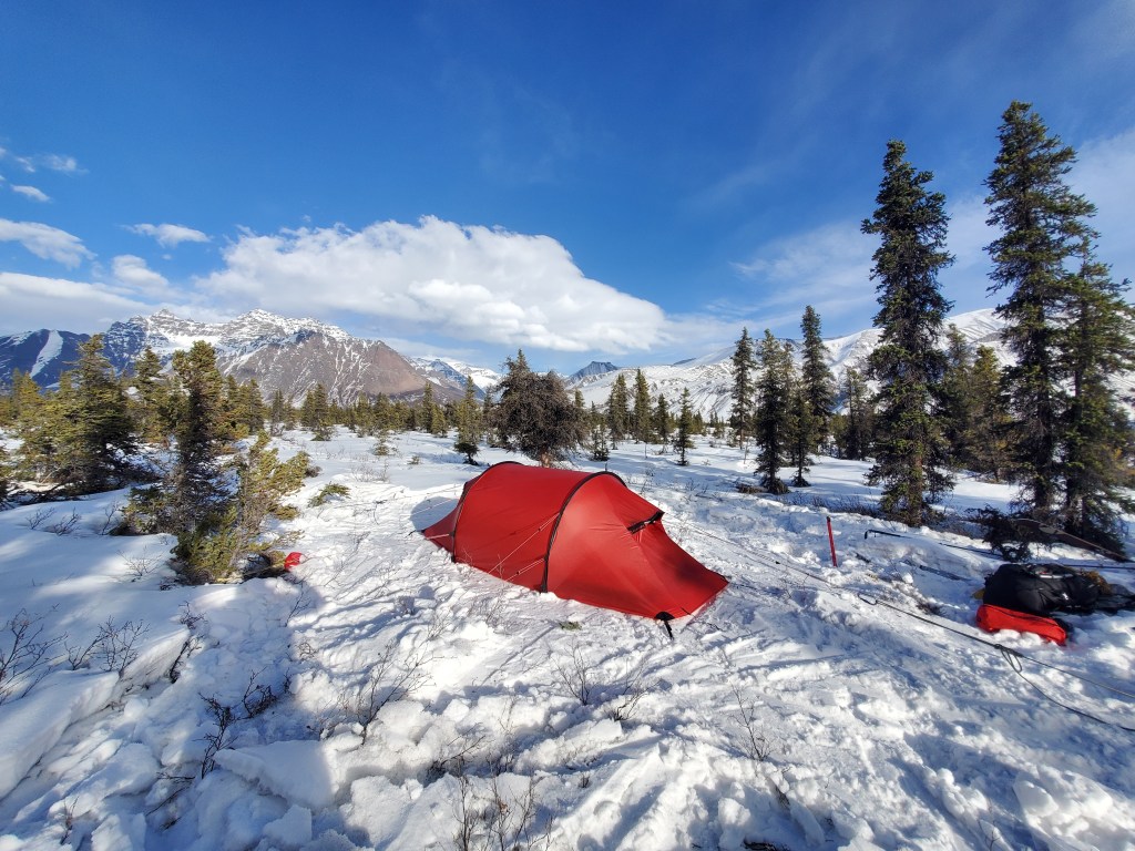 Just beyond the lake lived the tundra that served as a reintroduction to vegetation for us. We walked with our skis on horribly baked isothermal snow for a few miles looking for a snow machine trail east of Mt Fusil that I had spotted from the plane ride in. On the verge of giving up, I decided to take a long break. In this break Cody dropped his bag and ran off ahead to try to find the trail. I took the time to study my pictures and the map and finally pinpointed where the trail was. Cody returned and I explained he must have been close to the trail, so we headed back together and found the trail just past where he had gone. We built camp here and enjoyed the change of scenery that we had walked into.