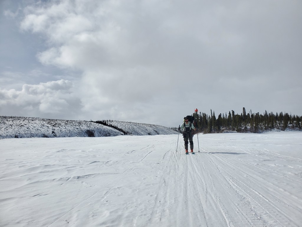After the quickest and easiest miles of the whole trip, we reached Mud Lake. It happened to be holding very wet snow that threatened to soak our skins. It was here we applied kick wax to our alpine skis, and began using the wax to propel us across the lake.