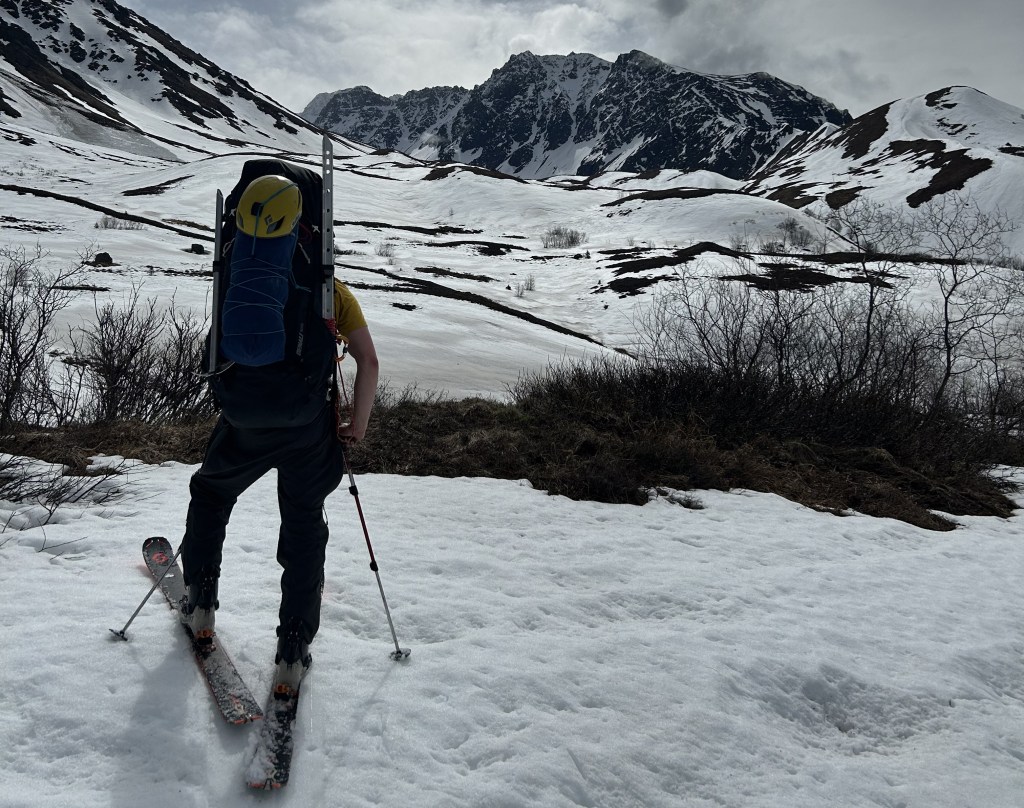 Waking to more clouds over the Eklutna, we elected to take daypacks up to the base of Transcendence Peak to look at the pass and get a decent ski in. We climbed up the scenic pass quickly, but did not see improving conditions on the backside. Better weather was with us on our side of the pass, so we talked about alternative exit plans, but did not set anything in stone. We turned around and skied what we had climbed which led us to a long lunch at our camp. Since we moved so quickly in the morning we had time to look at maps and Brian found an aesthetic ridge that would lead us back to the mouth of Peter’s Creek. After a couple hours of deliberation and watching the weather, we committed to walking out of Peter’s Creek instead of the Eklutna.