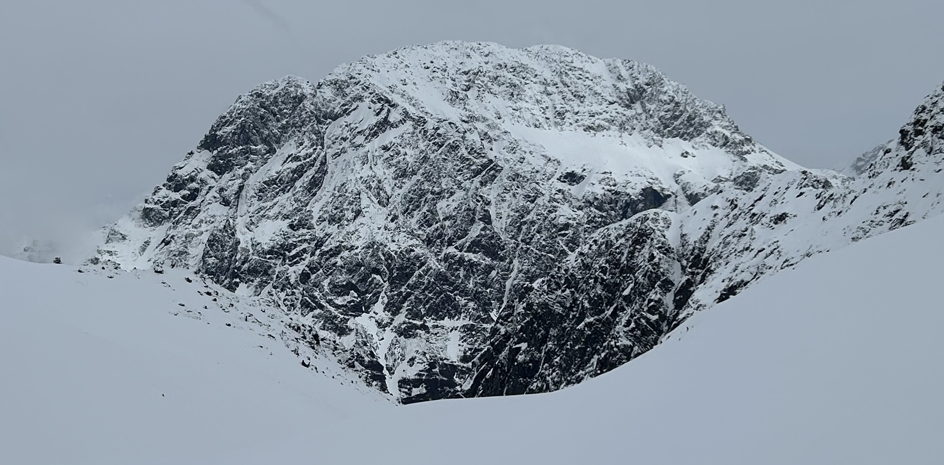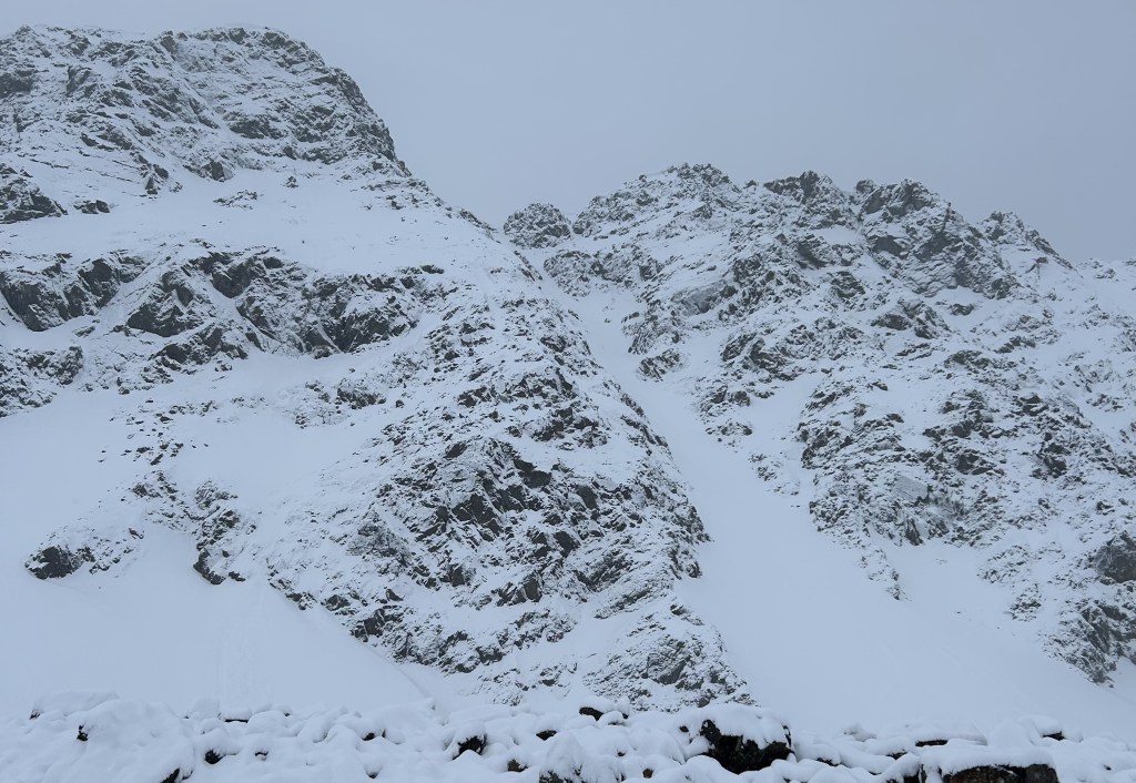 Instead of skiing in Ram Valley, we decided to push over Bombardment Pass and make our way down to Peter’s Creek. We made our way to the pass which we climbed one at a time. At that point, we had watched at least a dozen avalanches, and with old debris flanking our path over the pass, splitting up seemed to be the wise decision. As Brian climbed, I watched two D1s come down from Korohusk, but when I asked if he heard them, he remarked that he was so focused he didn’t hear anything.
