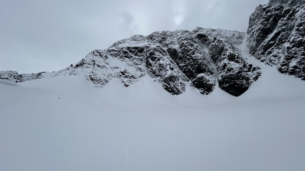 The next morning, we set off with daypacks to touch the Wall Street Glacier and explore the other fork of Peter’s Creek. We spent all day wrapping around Rumble, swapping between skis and boots depending on what the snow gave us. Eventually we found ourselves standing in the amphitheater that the Wall Street creates. It was amazing to be in such big terrain knowing we walked from the road. We had been hoping to see inspiring weather throughout the day, but it never came. We knew we would not be skiing any of the mega lines we were standing at the base of, but we had walked too far to not get any turns in.