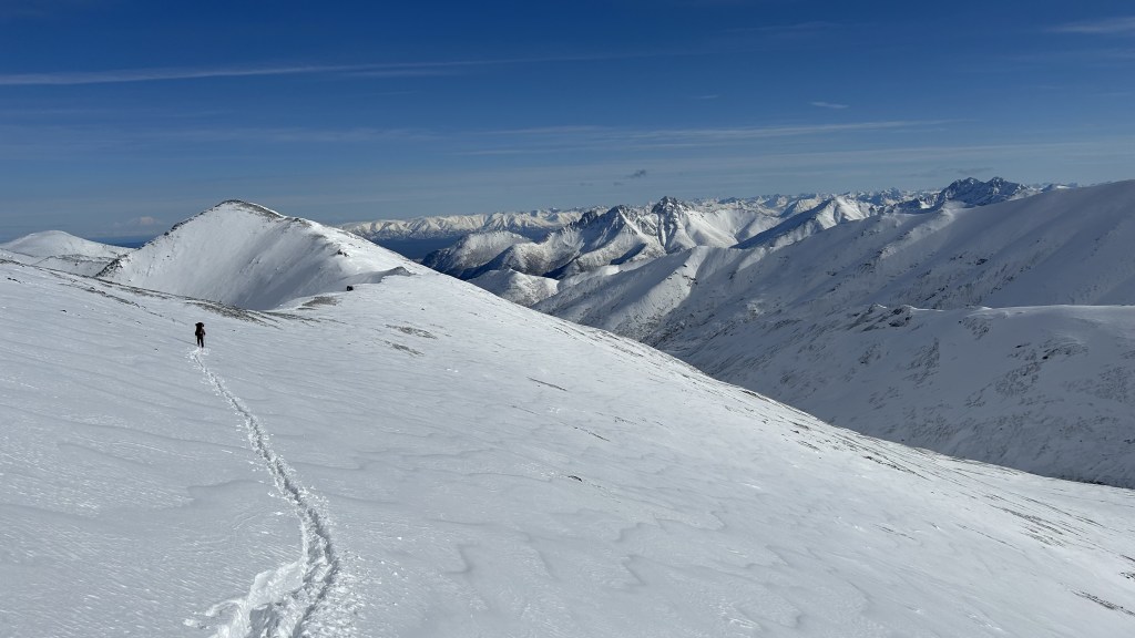 Feeling like we had exhausted our locations to find good, safe skiing at the top of the valley, we made our way to the ridge exit the next morning. Our plan was to connect Ah! Bees! Peak to Eklutna Peak. We would spend around 15 miles on the ridge if all went well.