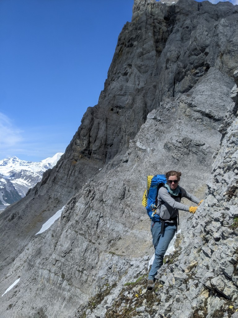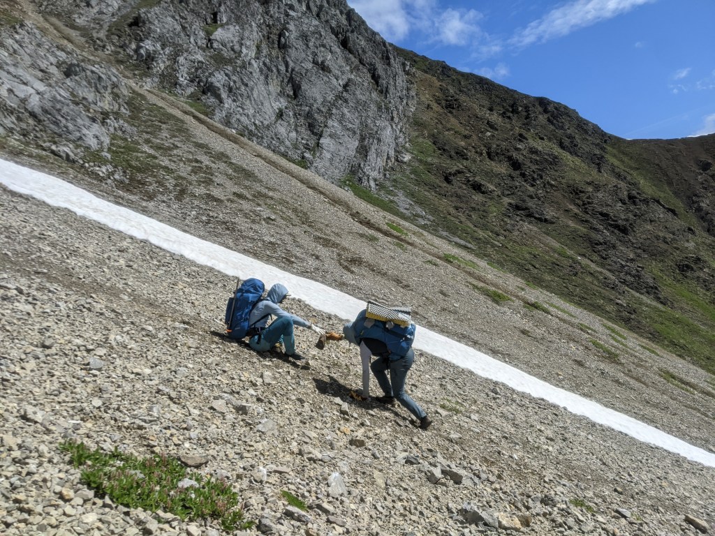 Progress on the descent was quick, and any worries of saturated choss were quickly disproven. This was a relief to us all, and allowed for a clear headspace on our way down. After a long break on tundra, we traversed our way into the south gully, and were delighted to find easily glissadable snow. This saved us lots of time as we ended up doing standing glissades for around 1,500 feet.