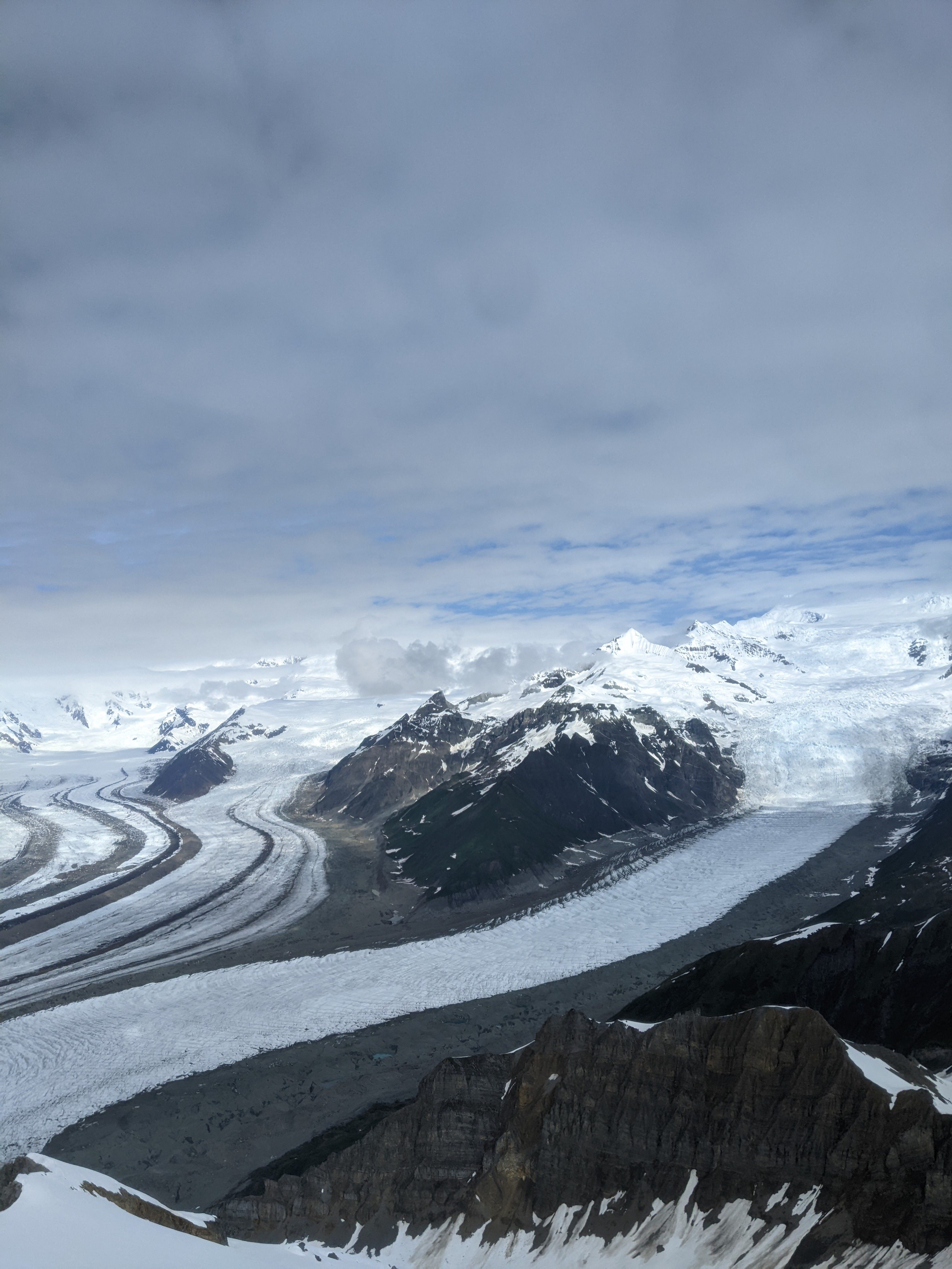 The following morning started with pancakes, a backpacking speciality of one of the members. As we ate our breakfast, the clouds began to part and we were treated to the best views yet. We enjoyed seeing all of the Gates and Kennecott glaciers, and the fog over the Root glacier provided a mysterious atmosphere to the morning. After breakfast, we broke down camp and began up.