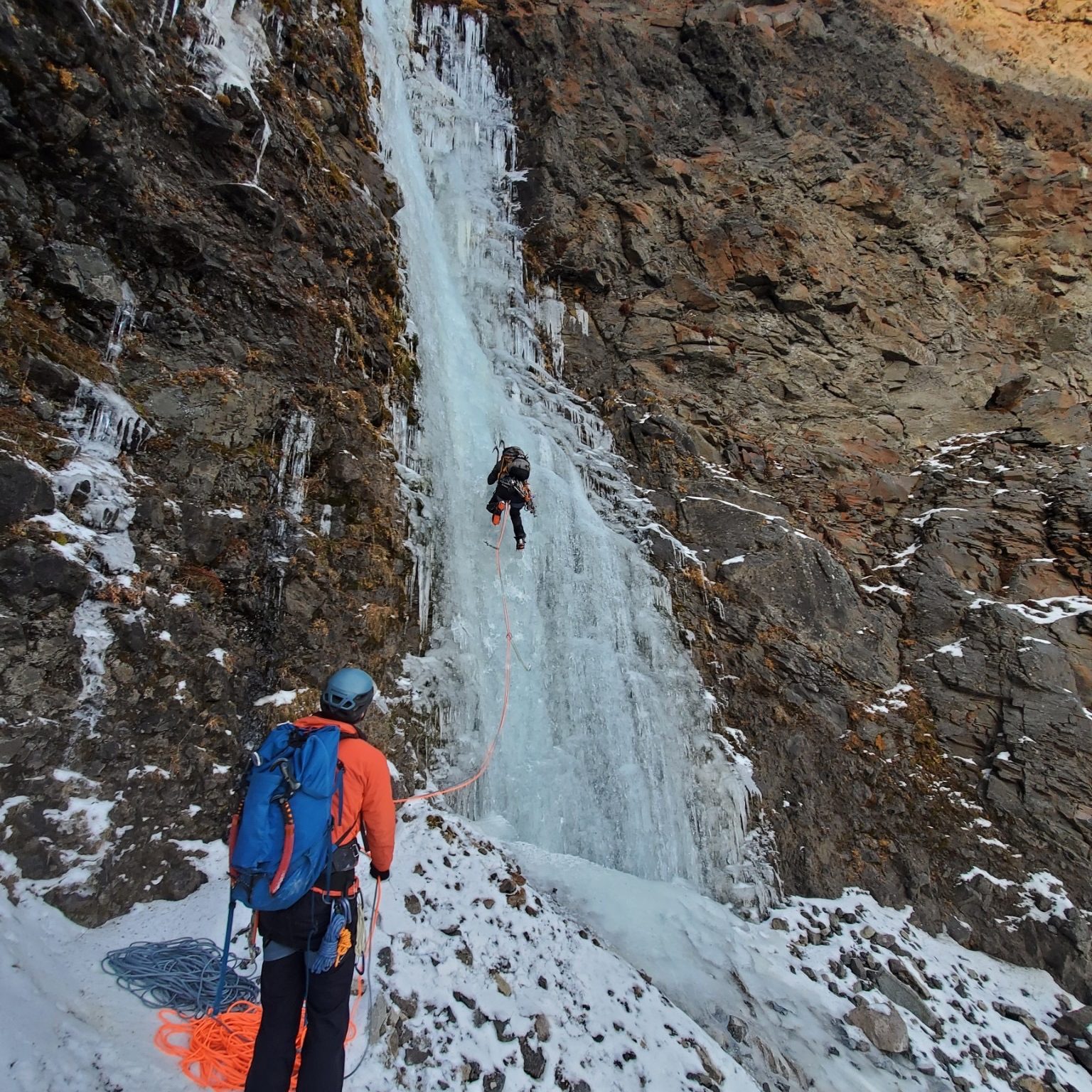The most obvious route to us was Spring Fling. This flow is arguably the easiest in the area while still providing a full day on route. The climb is given the rating of WI3-4 according to alaskaiceclimbing.com. WI4 is above my pay grade, but from what we could gather there was only one pitch of it on the route. Fortunately, one of the members of our group identifies as an ice climber and not a skier like the rest of us, and he was happy to get our rope up through the crux pitch.