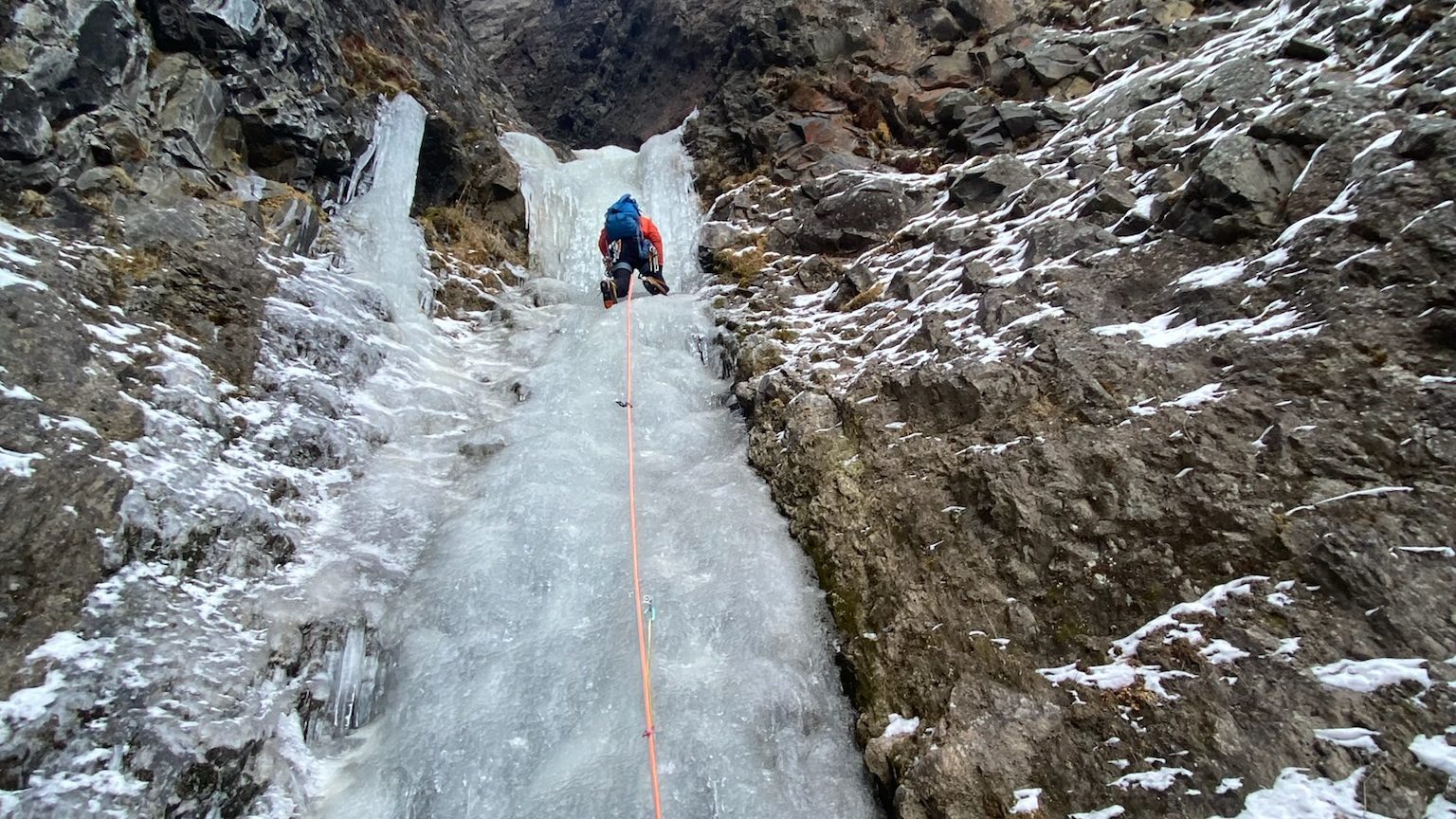 A few more pitches of straightforward WI3 stood between us and the top of the route, but within those pitches were sections of vertical chandeliered ice. We swapped leads for a pitch, and eventually found ourselves looking at a pinch in the gully that matched the description of the top of the route. My partner started out and made fast progress before reaching an unprotectable step. He kept his cool and climbed the pillar; at the top of the pillar he was met with low-angle, calf-burning ice for longer than was comfortable. Once the 70m rope was stretched, he built an anchor and brought me up. From his anchor, there were only a few more feet of ice to climb before the flow petered out. The second rope team made their way up, and soon we were planning our descent.