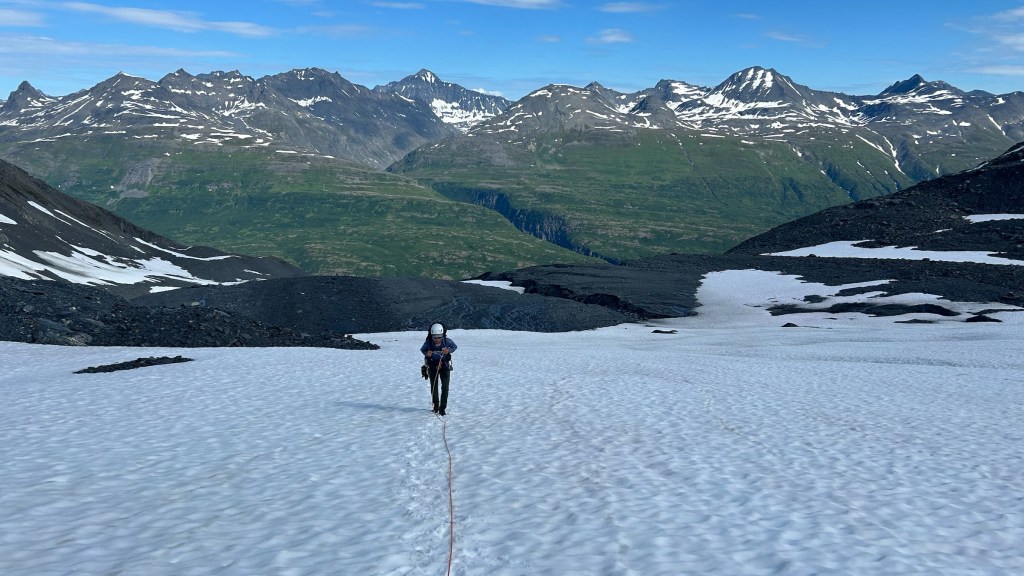After making our way through the tundra, we approached the snow covered glacier. After a snack break, we roped up and began up the snow. The glacier has obviously receded in recent years, but we were unsure to what degree. We saw sagging in the snow, but it often seemed more like a sign of running water underneath a shallow snowpack than cracks in a glacier. After a bit of an approach on the glacier, we made our way to what seemed to be the beginning of the rock climb. The steep snow travel made me excited for winter and the endless snow climbing that comes with it.