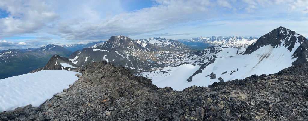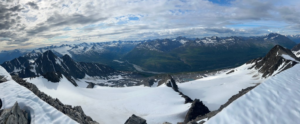 Upon reaching the peak, we took our time enjoying the views. One of the best parts of summer in Alaska is the endless days. Even though we had been climbing for a long time, there were no worries of daylight running out. Tristan and I marveled at the views of the Copper River, and Nurge was stunned by the scope of our views. We saw the Wrangells, Marcus Baker, Tom White, and all the beautiful Chugach peaks around Valdez. A long moment on the summit allowed us to prepare for the class 3 downclimb.