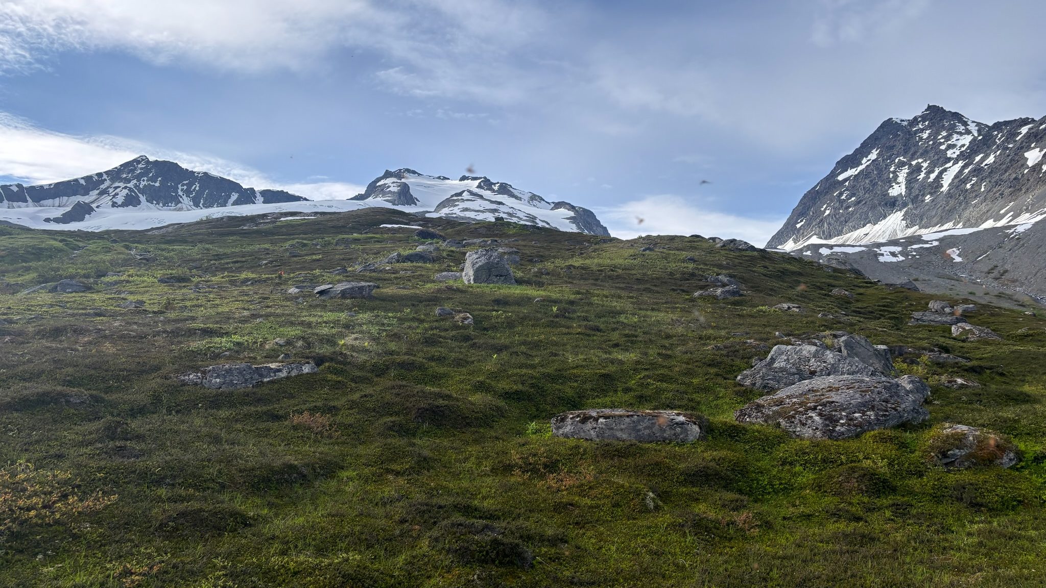 We woke to slightly overcast skies and ate a quick breakfast. We shuffled our cars a bit closer to the climb and quickly found the trailhead. The trail began through dense rainforest; without a trail we would have been in a never-ending bushwhack. The skintrack I had previously been on was on the same path as the trail, but the sheer amount of brush was hard to comprehend. We remained in the brush for some time but eventually rose above into a scenic tundra. From here the variety in terrain became more apparent. Above us were glaciers and alpine rock, and beneath was a lush forest.