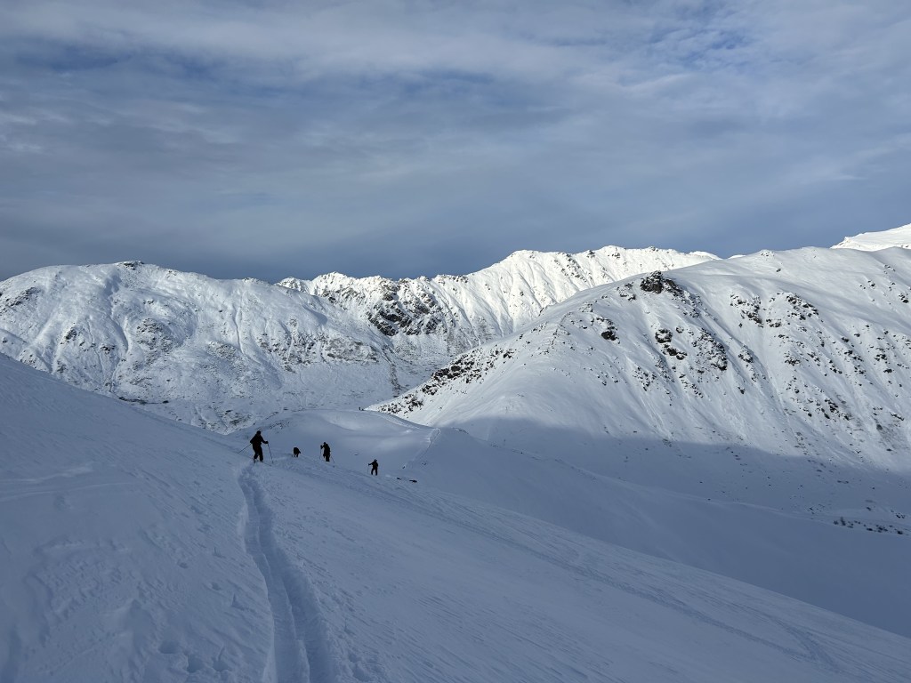 With a plan set, we loaded into her car Saturday morning and began the hour drive to Hatcher Pass from Anchorage. Clearing skies along the drive only added to our hopes for the day, and upon reaching the parking lot it seemed we weren’t the only ones who wanted to reap the rewards of the new storm. Unsure of where we wanted to ski in the pass, we drove up and down the road scouting out what looked best. To nobody’s surprise, Hatch Peak and April Bowl seemed to be holding the most snow. We join in the gaggle of cars all parked tightly in the parking lot beneath the peak, and swapped into our ski boots.