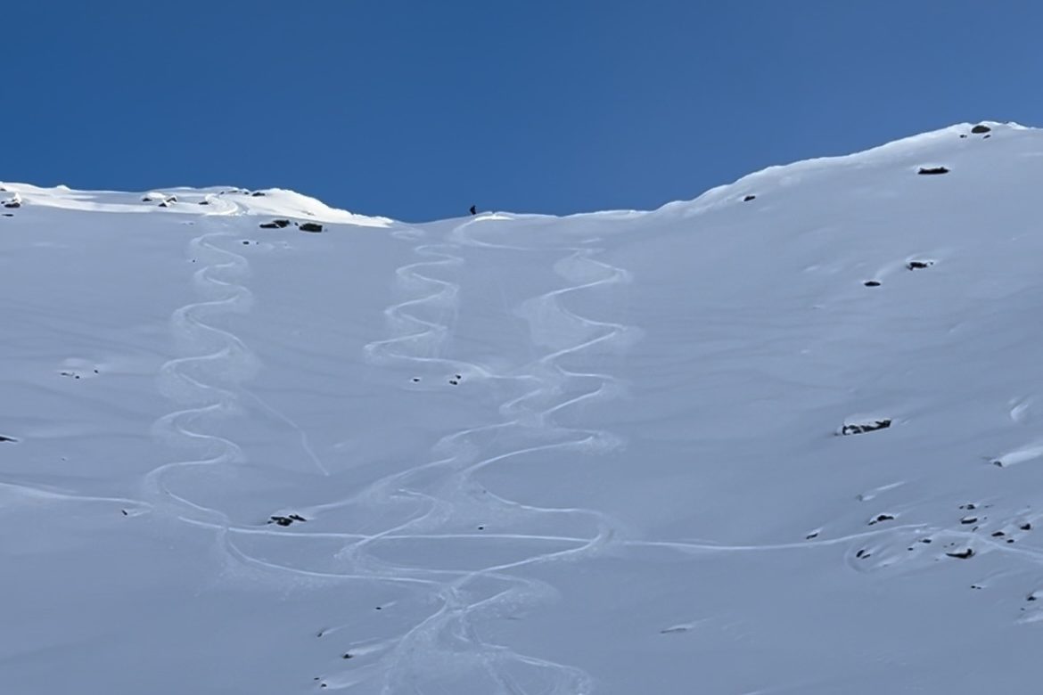 After a great ski through consistently boot deep powder, we knew we had to go back for more. We swiftly transitioned and made our way back up to the peak. As we neared the peak this time, I asked Olga if she was interested in skiing April Bowl, and the lack of traffic in the bowl drove her to say yes. This time upon reaching the summit, we skied an untracked line into April Bowl which provided even better snow (largely due to the lack of tracks). From the bottom of the bowl we took the short hike to allow us to ski out to the road, and enjoyed the rest of the snow we could before reaching our car.