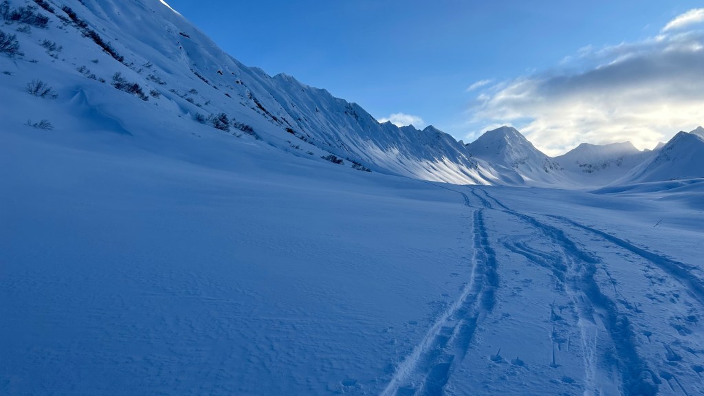 After rain battered Anchorage for weeks and snow caked the Chugach at upper elevations for 3 weeks, the storm finally showed signs of breaking up. Along with blue skies in the forecast, stable snow was found across the Turnagain zone. While the lighting and snow conditions lined up well, the temperature looked like it was going to be the crux of our day with the high forecasted for -5 fahrenheit at the road in the pass. Knowing this, Jordan, Raven, Truman, and I packed our heaviest puffy layers and met in Girdwood to take the early morning drive into the pass together.