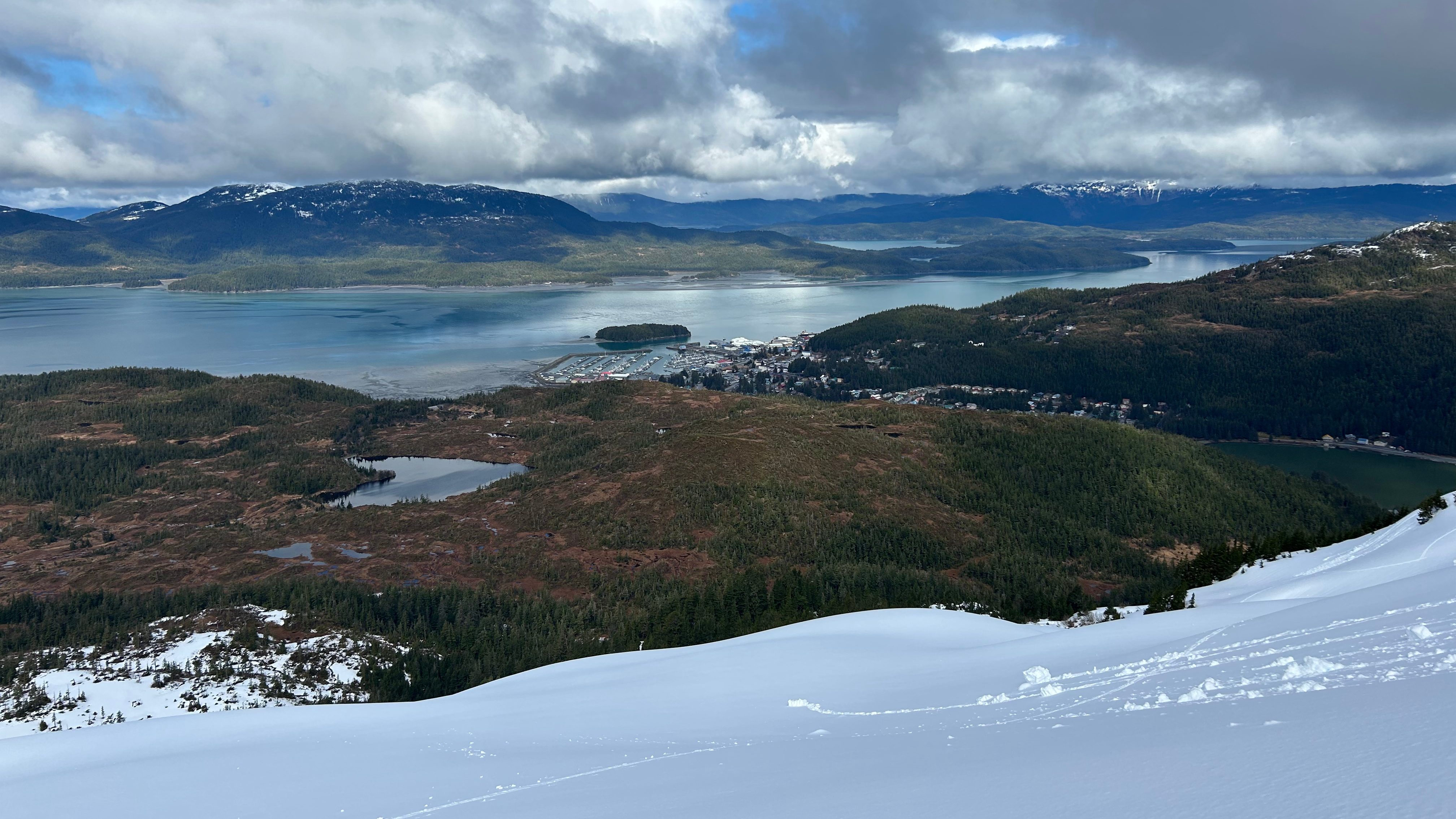My first lap found me skiing the shoulder proper towards Heney Peak. The snow was sublime, allowing for an enjoyable amount of penetration without ever slogging me down. As I descended, the snow quality began to deteriorate. Before the skiing became unenjoyable, I transitioned to get another go at the snow that I enjoyed so much. I quickly regained the shoulder and for my second lap enjoyed a front side lap looking right down on town. It was surreal feeling great snow under my feet while looking down on a lush, green rainforest. The lap was nice enough to inspire a third. The third lap mimicked the second, skiing towards town. I was hopeful that if I put enough turns down the face I’d be able to see them from town. On the third lap, rain began falling on the snow and the quality of the skiing showed signs of degradation. I cut my losses at the bottom of the third lap and began the adventure ski down to dry land.