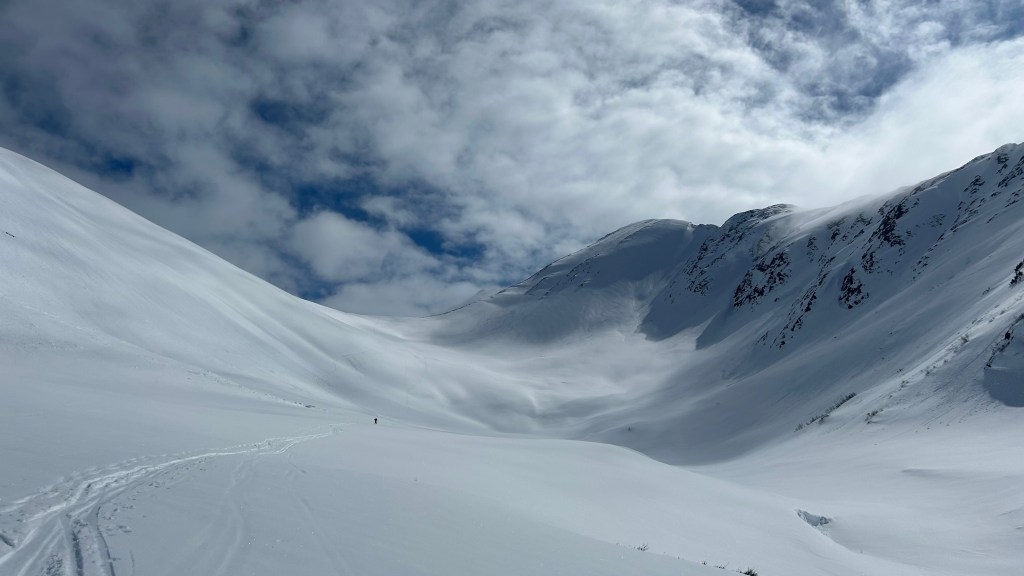 When we arrived at the Sunburst Parking lot, we quickly picked up on Raven and his friend’s tracks as they were about an hour ahead of us. We made decent time, stopping to enjoy the come-and-go views between the clouds that had us questioning if we’d have any visibility once we got to the skiing. As we gained the high valley, we spotted the group ahead of us nearing the pass. From that point forward, I was able to communicate with Raven via our radios, and he told us they were going to begin the climb to the peak that separates Taylor Pass from Goldpan and wait for either a clearing in the skies, or for us to catch up–whichever came first.