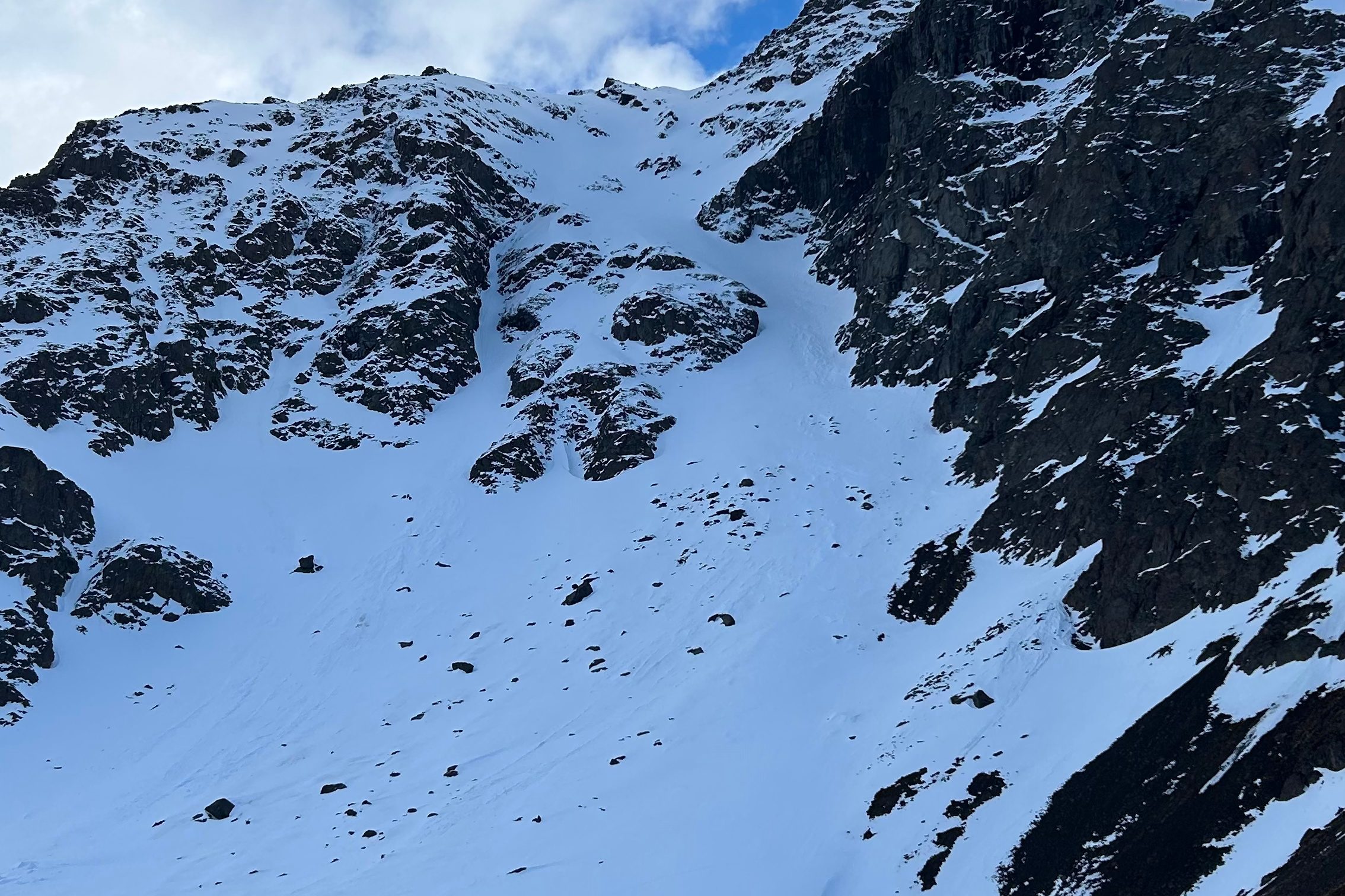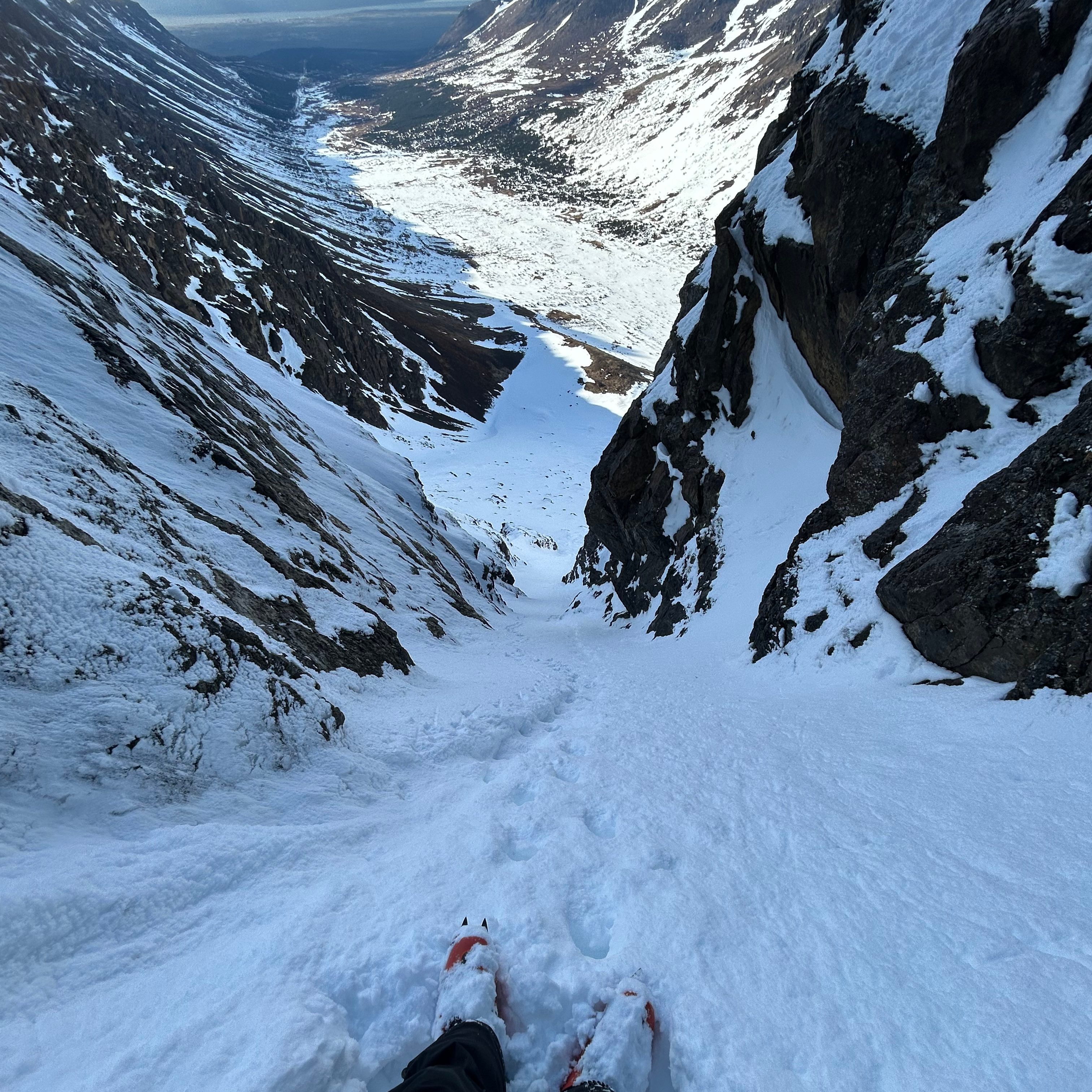 On May 9th, I was working in the Hillside area which set me up perfectly to take a shot at the S Couloir. As soon as my day was over, I did the short drive up to the Glen Alps trailhead and began down the trail on dirt while in my ski boots. Quickly the dirt transitioned to snow which allowed for fast progress on my skis. After the 4.5 mile hike into the base of the line, I stopped to take a break and have a bite to eat. In this break, the ominous weather that sat over Powerline Pass quickly made its way to Ptarmigan Peak, and by the time I was having my last bite, I found myself getting snowed on at a moderate rate. While there wasn’t a massive amount of snow falling, it was enough to begin sluffing off of the upper slopes and due to the uncertainty and fact that I was skiing alone, I searched for a way to safely mitigate the new snow while still achieving some skiing.
