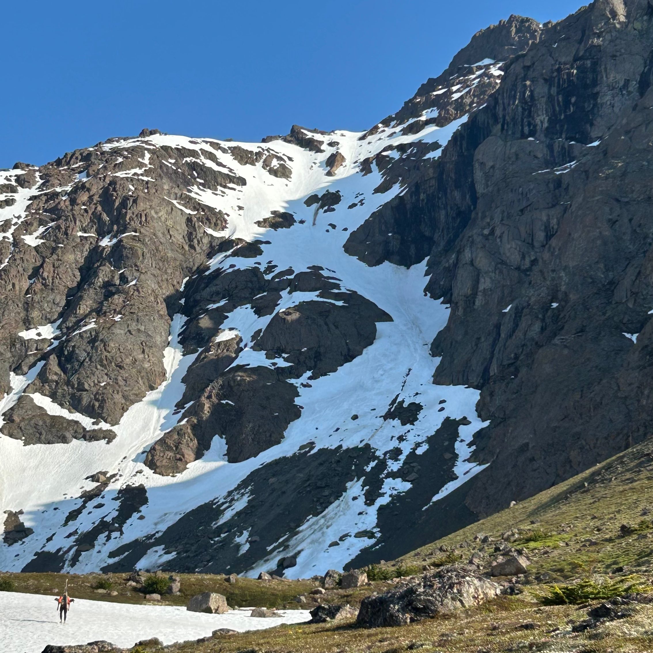 Rising above the houses that make up Anchorage’s Hillside region, Ptarmigan Peak is one of the many peaks on the ridge that divides the Campbell and the Rabbit drainages. On the steep north face of Ptarmigan Peak lives a ski line so obvious from town that any skier with a keen eye will eventually land their sights on it. In mid-winter conditions the line can fill out, but due to it’s steep and shaded nature, it tends to be skied into the summer when the line resembles the shape of the letter S—giving it the name Ptarmigan’s S Couloir.