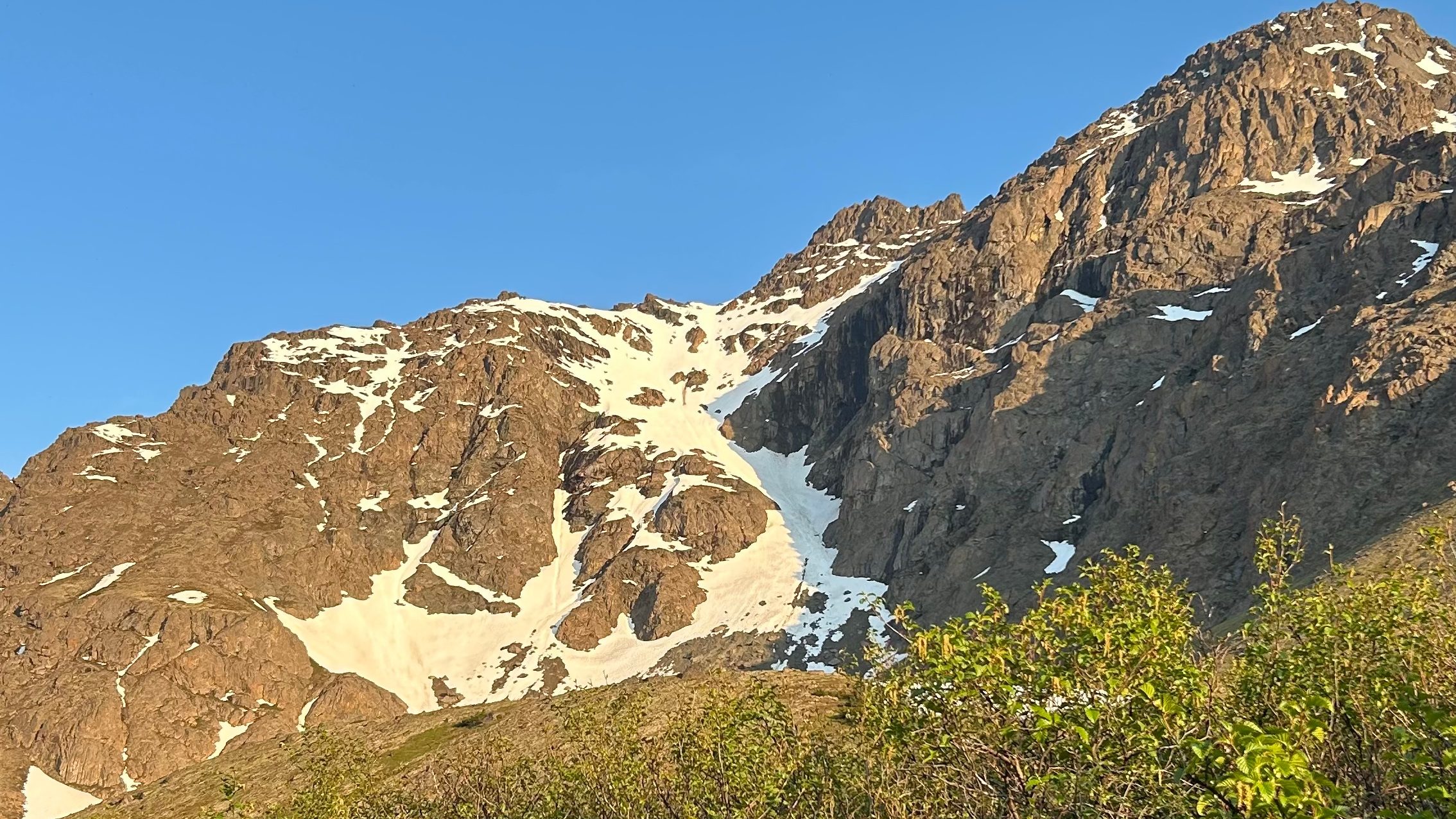 As summer days continued to lengthen I found myself watching the snow melt out of the couloir from my office at Merrill Field. On the longest day of the year a few things lined up to motivate me to bring my skis along with me to work. This year, the summer solstice landed on a Friday and there was hardly a cloud in the sky for the midnight sun to hide behind. After watching the weather through a window all day, I was soon driving up Toilsome Hill towards the Glen Alps. I indulged in a mediocre Wendy’s Baconater in the parking lot and next realized I didn’t have a T-shirt to tour in.