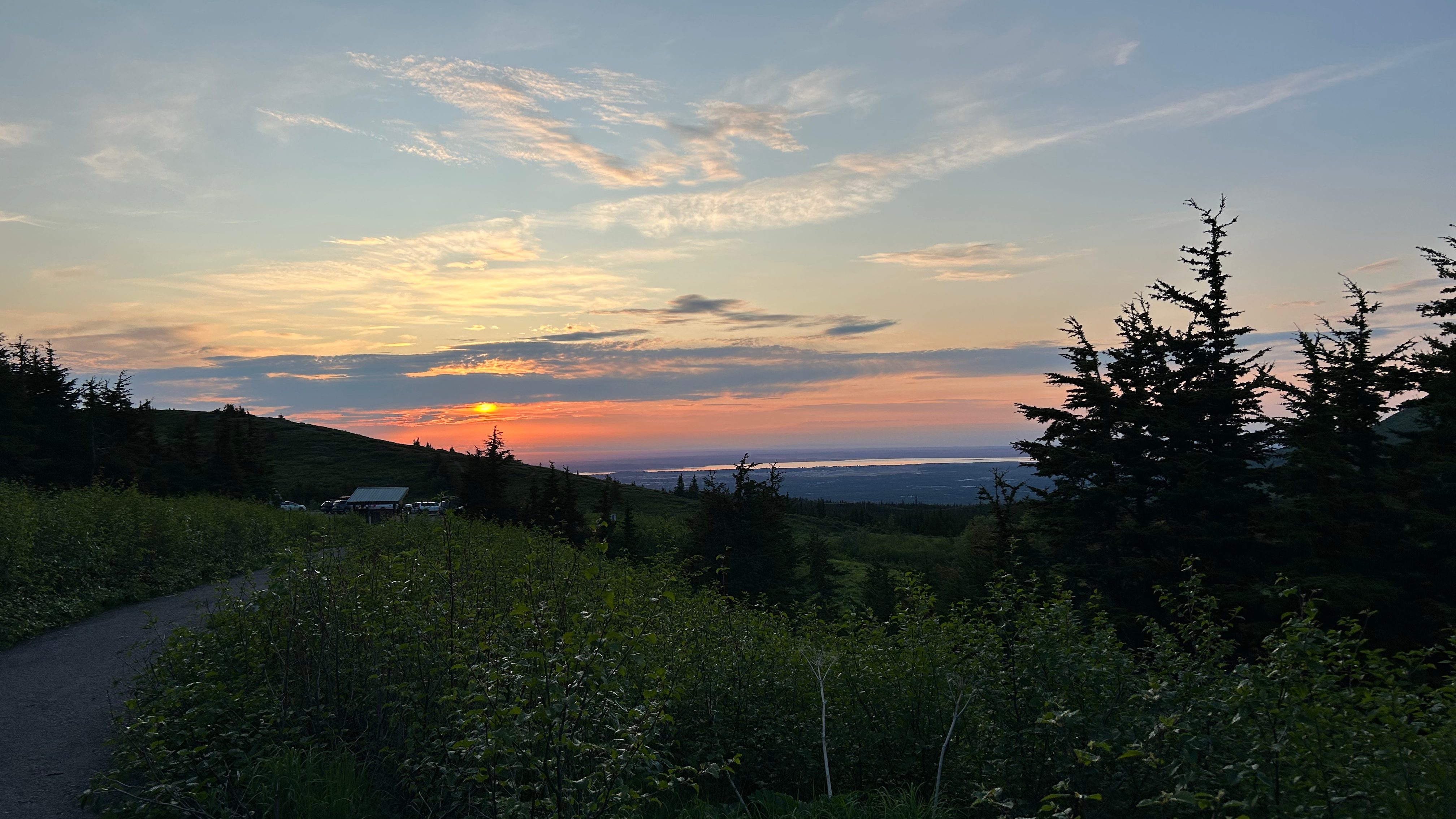 As we looked up at the line, we all felt proud to claim such an aesthetic line on a day celebrated by so many Alaskans. As we said our goodbyes, I was extremely jealous of the other two for having their bikes, but I was at least happy to know the majority of the hike would be downhill. I watched as the two cyclists made out ahead of me, tossed in my AirPods, and enjoyed the prideful walk back to the parking lot. As I was nearing my car at 11:30pm, I was greeted by a stunning red sky with the sun behind thin clouds that had rolled over the western Alaska Range. I took a moment to appreciate the wonder of nature that is the midnight sun, the amazing skiing that we have year-round in Alaska, and all of the crossroads in my life that had led me to this moment.