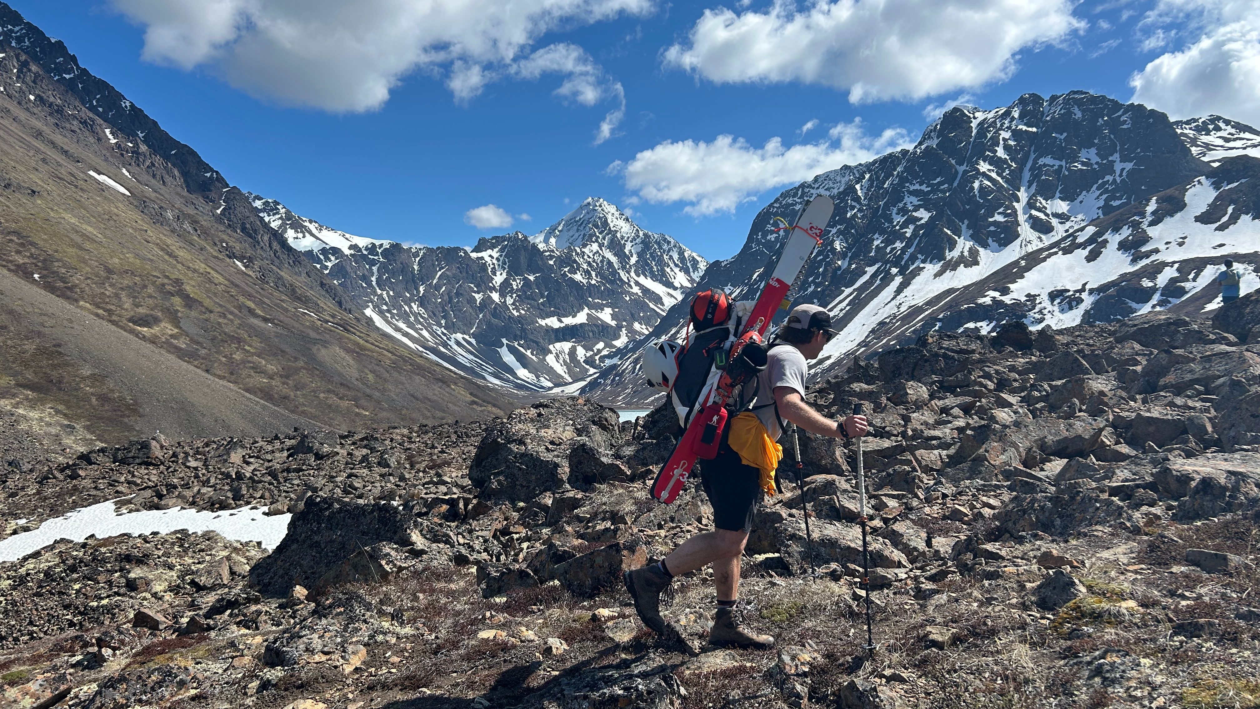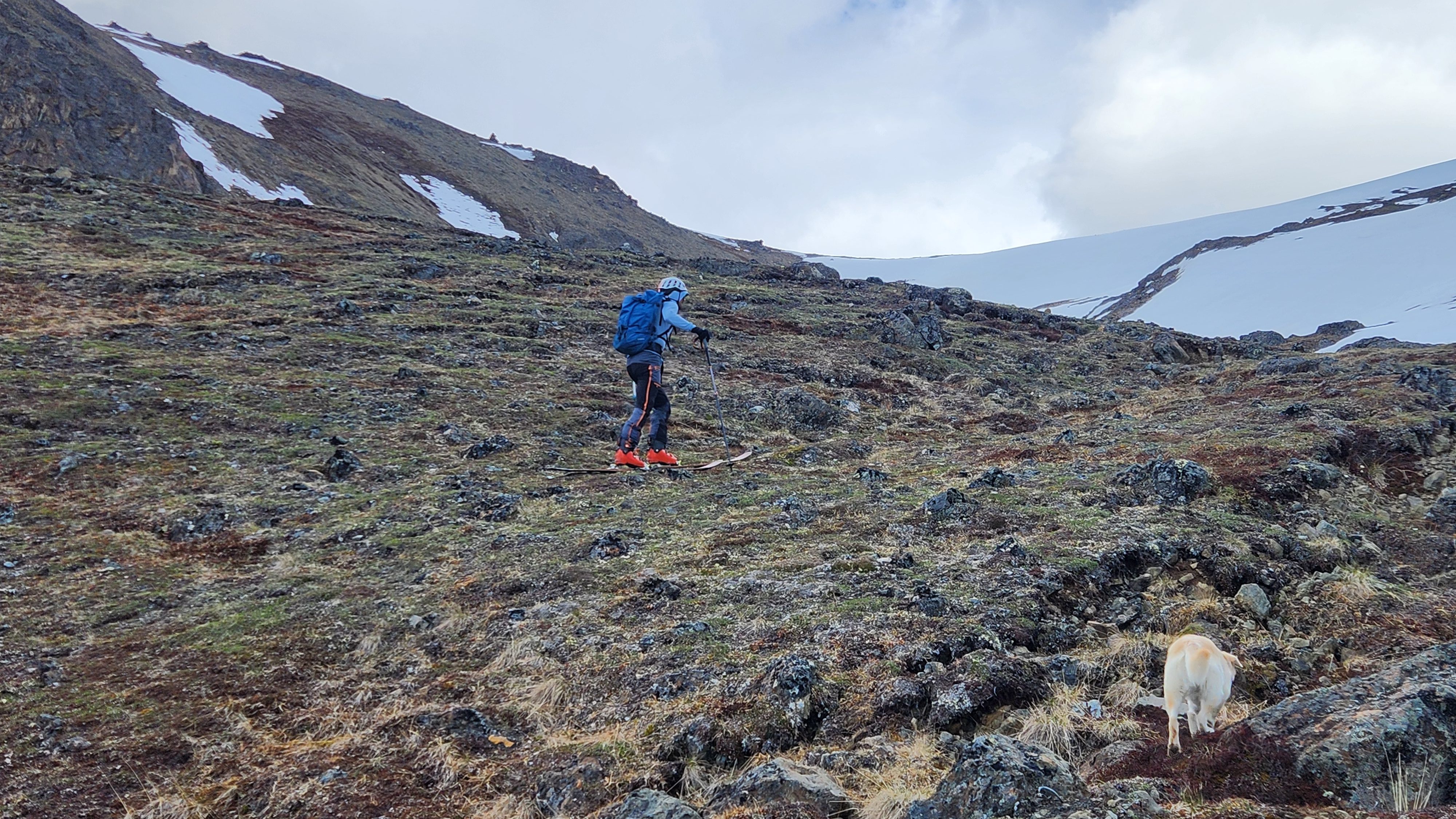 As we booted up a boulder field, Andrew yelled at me to stop and get ahold of Nala. I wasn’t sure what was possibly going on, but the urgency in his voice made it clear he was not joking. He then hastily explained there was a wolverine just a few feet in front of me and while I was out of view, Andrew and the wolverine were having an intense stare down. Holding onto Nala, I curiously worked up a bit more to get a view of the wolverine which was enough to spook the beautiful creature off of the snow patch that contrasted its dark brown and cinnamon body. As the wolverine climbed through the rock garden and found a high point 20 feet away from us to observe our intentions, two cubs emerged from the pile of Chugach choss. They looked towards their mother for guidance, and joined her in holding an unbreaking gaze in our direction. Without a word, Andrew and I both knew it was time to give the wildlife that we had accidentally encroached on the space they deserved. We traversed away from the probable den and made sure to clear the area by a wide margin before unleashing Nala. The moment was both intense and beautiful at the same time; to see a wolverine can be a once in a lifetime moment, but to see three in such close proximity to us felt truly special and is something neither of us will be forgetting anytime soon.
